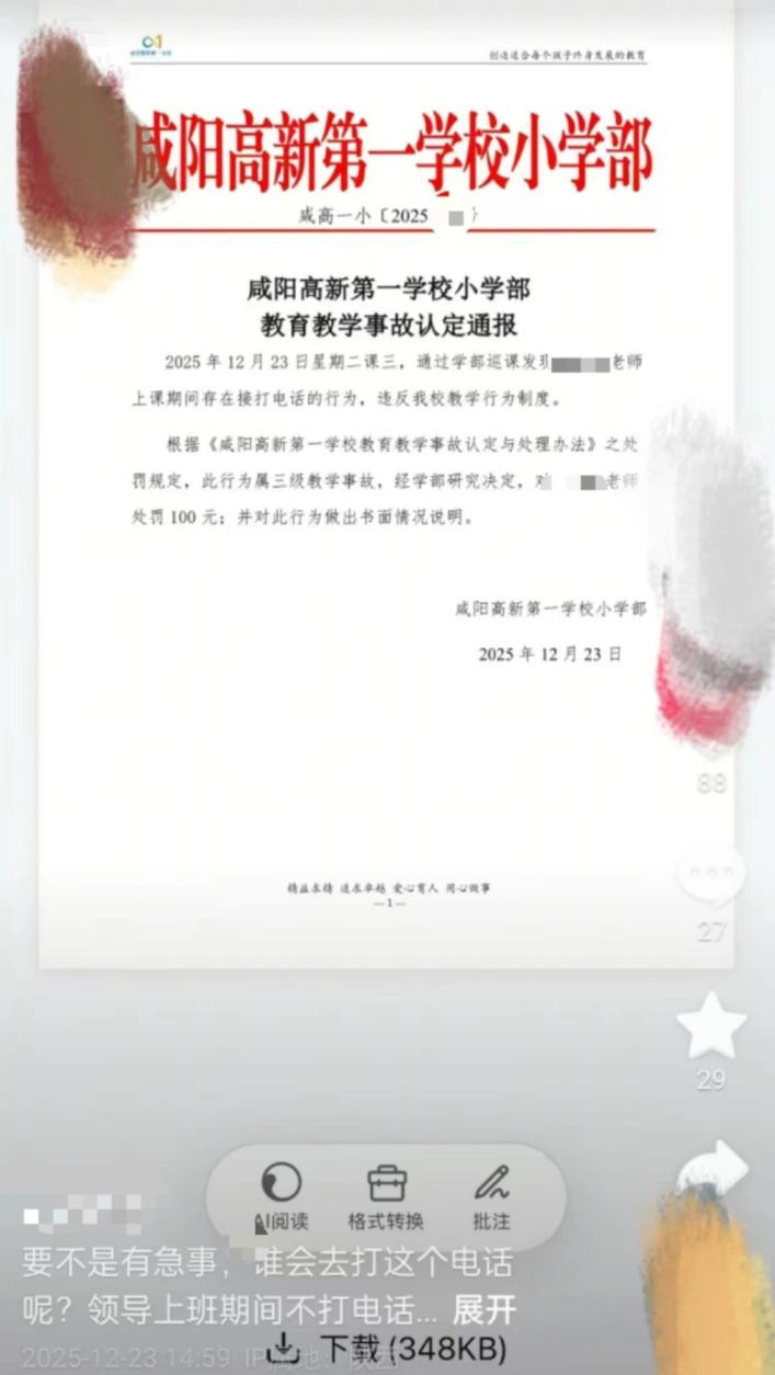 12 月 24 日,该校工作人员回应称事件已内部处理完毕,强调 “学校有相关规定”,未回应网友对处罚严格的质疑。该校另一位任课老师透露,学校明确禁止教师将手机带入教室,“课比天大,要敬畏课堂”,课上接打电话属严重违规行为。咸阳高新区管委会教育部门则表示,对相关情况暂不了解,且未制定教师课堂接打电话及教学事故认定的具体规定,由学校自主制定相关制度。